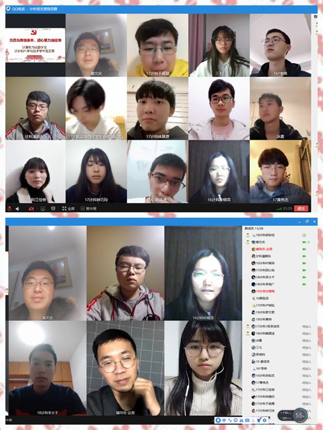 为深入学习贯彻落实习近平总书记关于防控新型冠状病毒感染肺炎疫情的重要讲话精神,深化支部党员防疫思想认识、坚定战胜疫情的信念与决心,发挥党员的先锋模范作用,计算机科学与技术专业学生党支部于3月11日开展了线上主题党日活动。此次党日活动以“党员先锋做表率,凝心聚力战疫情”为主题进行线上学习讨论交流,本次活动是一场别开生面的“视频”主题活动。本次活动由党支部书记裴文庆组织开展,支部师生党员、预备党员参与。