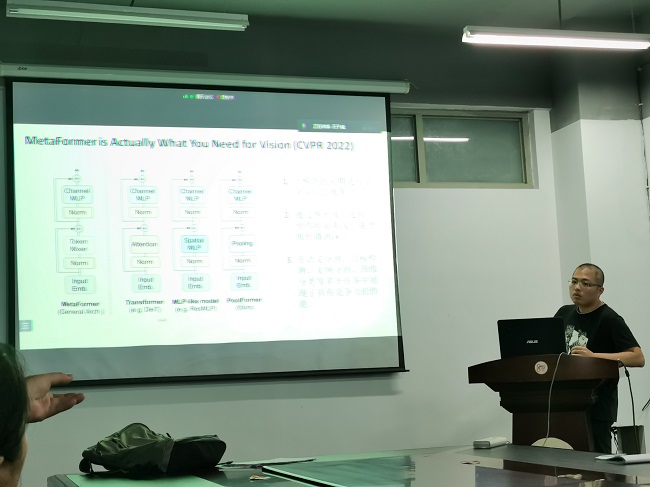 石子威同学的汇报主题为“Introduction of several new transformers”,主要介绍了三个最新的关于Transformer的研究工作,分别是发表于TPAMI 2022的《P2T: Pyramid Pooling Transformer for Scene Understanding》、ECCV 2022的《AiATrack: Attention in Attention for Transformer Visual Tracking》以及CVPR 2022的《MetaFormer is Actually What You Need for Vision》。汇报从模块结构、创新点以及作用这三个方面展开,通过论文的开源代码和消融试验详细分析了模块有效性,论述了将其引入图像特征匹配网络的原因,并在最后介绍了基于MetaFormer的思想设计的ContextFormer以及相应的消融试验,该模块能够有效提升特征匹配网络的性能。