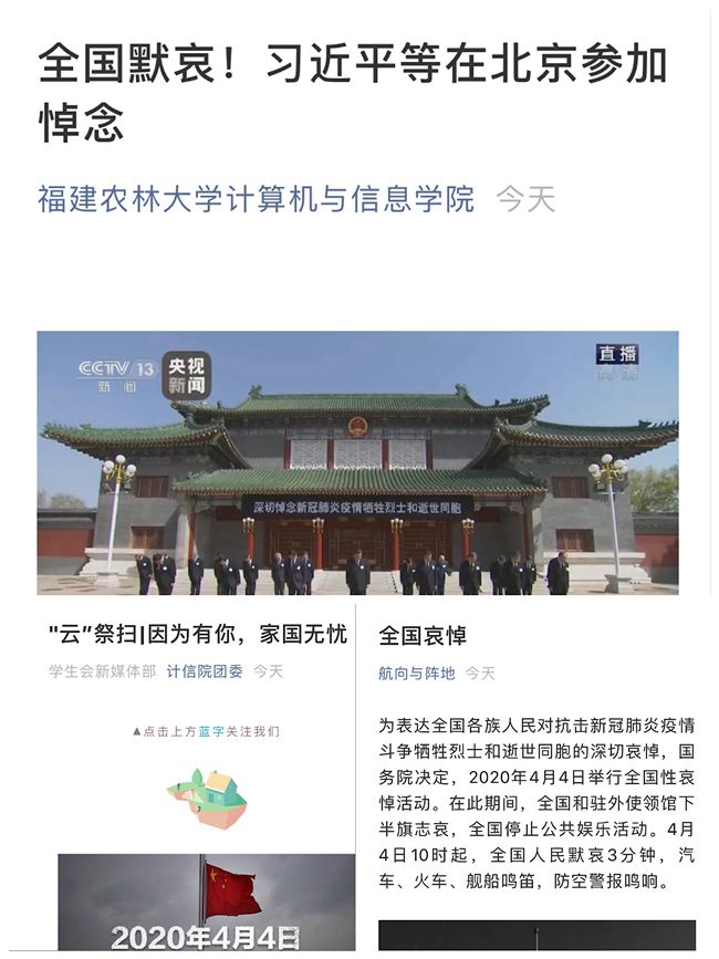 三是利用“龙8在线登录官网-龙8(中国)”、“计信院团委”、“航向与阵地”等微信公众号相继发布推文,号召学院广大师生在全国哀悼活动期间一起缅怀英雄,祭奠逝世同胞。学院鼓励师生在疫情期间采用线上“云祭扫”的方式,防范隐患、弘扬新风、缅怀先烈,实现“网络祭扫、安全祭扫、生态祭扫”。