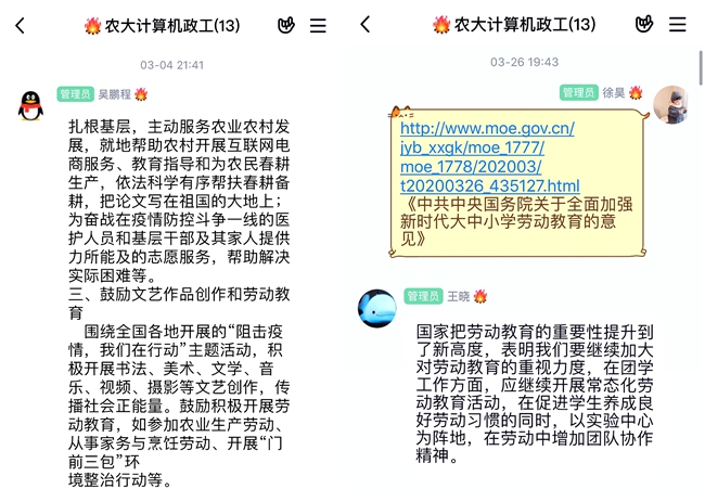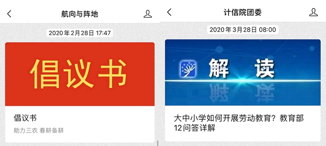 2月28日,学院微信公众号“航向与阵地”发布《助力三农,春耕备耕》倡议书,号召学院党团青年和学子们在全力做好疫情防控工作的同时,主动服务农业农村发展,培养知农爱农情怀,就地帮助春耕生产。3月28日,学院微信公众号“计信院团委”发布特别推文,就教育部如何开展大学生劳动教育进行了问答详解。学院团委思想教育与学习部专门就工匠精神、劳动精神、劳模精神收集学习材料,供全院师生开展学习讨论。