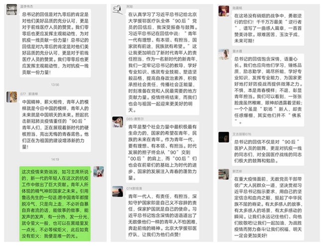 19预科1班的出森强同学说:“总书记的重要回信,温暖亲切、语重心长、催人奋进,读完回信,我激动万分。我深知这封回信不仅仅是给北大学生的,更是给所有的中国青年的,是对这群有抱负有理想敢担当的青年们的充分肯定,饱含着对新一代青年的殷切希望。”19预科3班的木合普力说:“青年一代人,有责任,有担当,深知守护国家即是自己义不容辞的责任,保家护国就是自己的使命。总书记的回信是对九零后的肯定,更是对前线医疗人员的赞赏。我们零零后也更应发挥主观能动性,为抗击疫情贡献力量!”