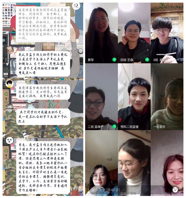 疫情期间为推进班级建设,加强防疫安全知识宣传教育,提高同学们线上教学学习的自觉性,2019级少数民族预科班召开了线上主题班会和班委会议。会上,辅导员、班主任、任课老师等为同学们科普了新冠肺炎疫情的有关内容,呼吁大家疫情期间减少出门,不得提前返校,认真开展网课学习。班会还进行了接受新团员的有关议程,老师们鼓励新加入中国共青团的同学要严格要求自己,做好榜样示范作用,主动担当作为。此外,辅导员黄维还召开了线上班委会议,就如何开展班级文化建设、如何增强班级凝聚力、了解同学们在疫情期间的生活困难和心理健康等问题了解有关情况、开展相关工作。