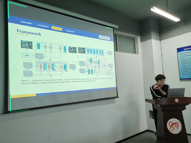 方万传同学的汇报主题为“多合一的图像恢复”。汇报从研究背景、问题描述、实验方法、实验结果等几个方面展开,介绍了通过采用一个模型对各种降质图片处理的整个过程。