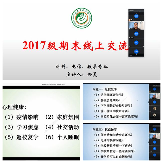 本次期末线上交流暨考研就业创业工作动员会围绕期末诚信考试、常态化疫情防控、返校复学情况、权益保障、心理调适、暑期安全、考研备战、就业创业等话题开展了师生线上交流。活动旨在通过线上交流动员会的形式,勉励和引导同学们在疫情和线上教学期间主动适应外部环境新变化,科学合理谋划,积极主动作为,把个人“小我”融入国家发展的“大我”,勇做走在时代前列的奋进者、开拓者、奉献者,在攻坚克难中创造更大业绩!