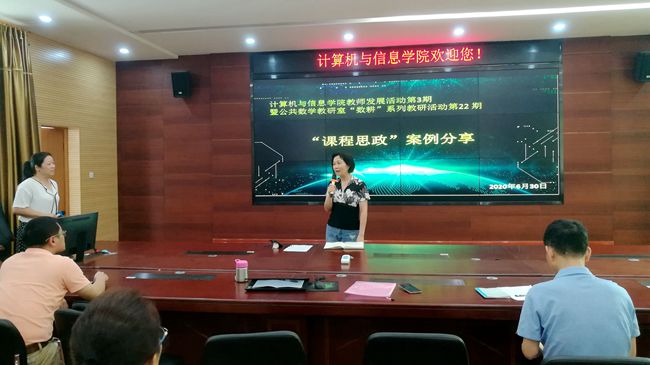 6月30日下午,龙8在线登录官网-龙8(中国)第3期教师发展活动暨公共数学教研室“数耕”系列教研活动第22期“课程思政”案例分享会在宝铃楼103举行。学院党委书记孙淑芹、副院长李德新全程参加了此次活动。本次分享会由公共数学教研室承办,教研室王燊老师策划并主持了此次活动。