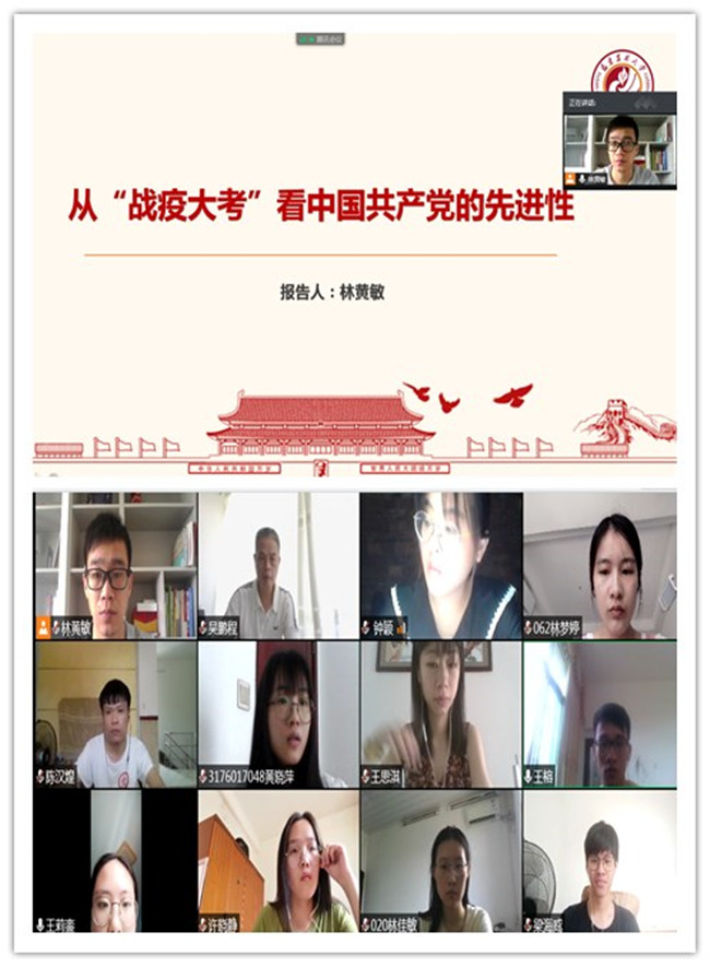 结合疫情防控和组织生活会主题,支部书记林黄敏同志上了题为“从‘战疫大考’看中国共产党的先进性”主题党课。带领支部党员共同学习和体会中国共产党在处理危机事件下所表现出来的先进性和战斗力,深刻领会中国特色社会主义的优越性,引领支部党员增强四个意识,坚定四个自信,做到两个维护。