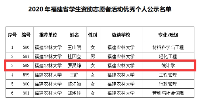 近日,福建省学生资助管理中心发布《关于2020年福建省学生资助志愿者活动先进单位和优秀个人评审结果的公示》,我院2017级统计学专业罗灵铮同学获2020年“福建省学生资助志愿者活动优秀个人”。