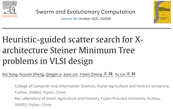近日,龙8在线登录官网-龙8(中国)钟一文教授团队在国际知名期刊《Swarm and Evolutionary Computation》(群体与进化计算)发表了“Heuristic-guided Scatter Search for X-architecture Steiner Minimum Tree Problems in VLSI design”(求解VLSI设计中X架构斯坦纳最小生成树问题的启发式引导分散搜索)最新研究成果。该期刊隶属于爱思维尔(Elsevier)出版社,是群体智能与进化计算领域的权威期刊,收录面向复杂系统的智能优化理论、方法及应用方向的相关研究成果。论文第一作者为2023级硕士生杨凯,钟一文教授和团队青年教师林虞博士为共同通讯作者。