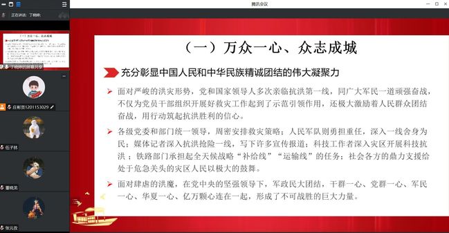 会上,支部党员伍子林分享的内容为《论持久战》,从内容精要、历史影响以及现代意义等方面进行讲解;表明了毛泽东发表的《论持久战》在中国抗日战争的重要关头深刻分析战争的形势和特点,科学预见了战争前景和进程,明确指出胜利的道路和方法,回答了困扰人们思想的种种问题,对鼓舞全国人民必胜信心产生了重大影响。支部党员丁晓婷主讲的题目为“弘扬伟大抗洪精神”,她表示党员同志要向抗洪英雄们学习,发扬伟大抗洪精神,以勇于自我革命的气魄、顽强拼搏的毅力开启全面建设社会主义现代化国家新征程。支部党员胡清萍主讲的题目为“五卅运动”,讲解了五卅运动的历史背景、五卅运动过程以及五卅运动所带来的影响。