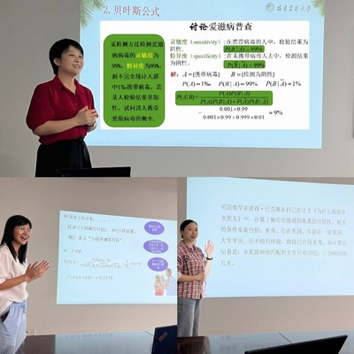 沈群老师利用贝叶斯公式计算艾滋病普查中初筛和复筛的阳性概率,采用测量、实践和检验的科学方法论,说明医学领域中疾病复查的重要性。田立老师通过贝叶斯公式演示了古希腊寓言《狼来了》中,村民对放羊娃信的任度是如何下降变化的,体现了社会主义核心价值观,强化了公民个人层面的价值准则-诚信教育。张慾老师从贝叶斯公式的迭代修正特性出发,模拟了不同时期伴侣理想程度的波动,寓意“起点高低影响脚下,努力程度决定未来”的长远人生观。