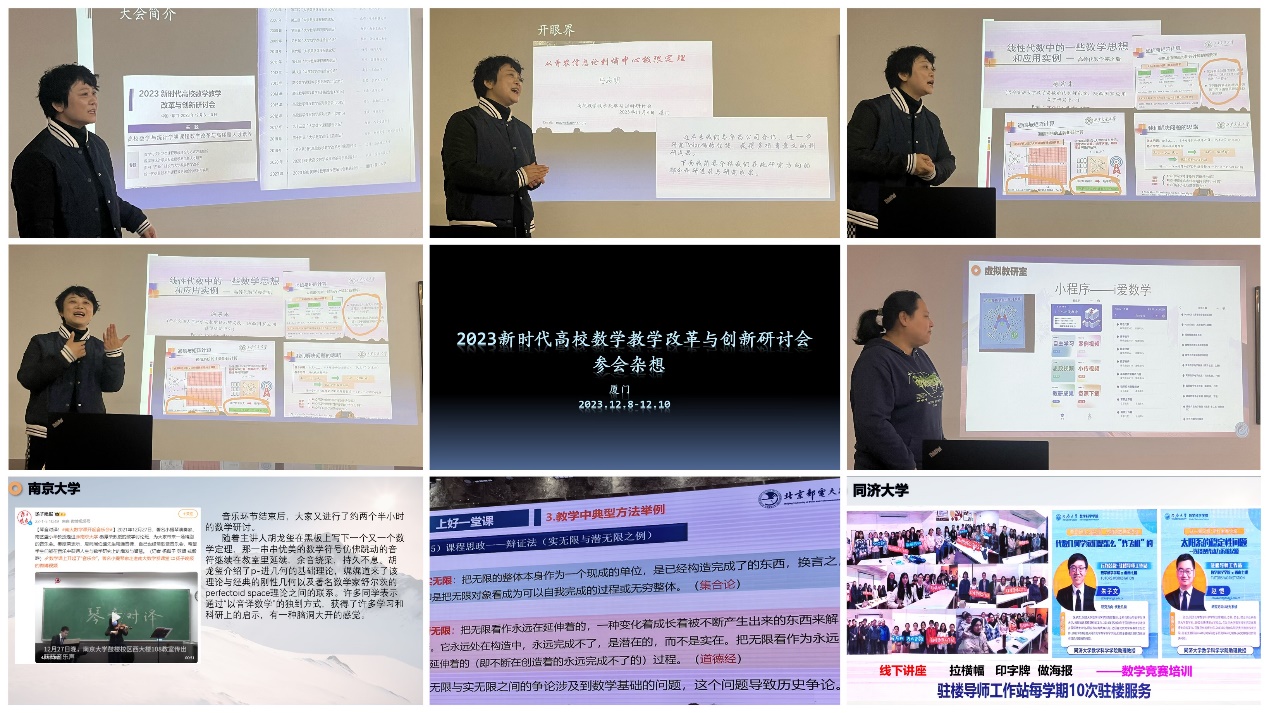 沈群、张萸两位老师作为参会人员表示收获颇丰,并分享报告部分内容:徐宗本教授介绍的线性代数课程与前沿科技如何融合,孙洪祥教授分享了如何将“辩证法”融入高数课程(课程思政元素的挖掘与融入),同济大学概率统计的教学创新探索,免费使用且资源丰富的小程序“i爱数学”等,分享形式使其它老师也获取最新的教学改革信息,为教学改革研究提供了更好的支持。