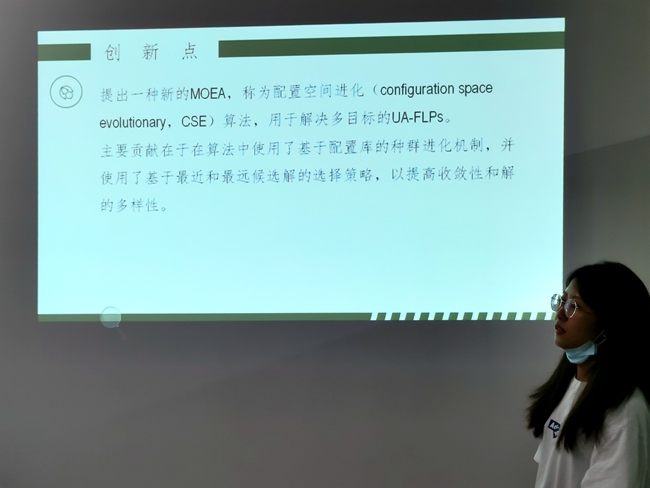 在学术交流会上,2020级计算机科学与技术专业硕士研究生梁毛毛分享了“Balancing constraints and objectives by considering problem types in constrained multi-objective optimization”的研究情况。2020级计算机科学与技术专业硕士研究生沈爱玲分享了“Configuration space evolutionary algorithm for multi-objective unequal-area facility layout problems with flexible bays”的研究情况。同时,与会师生就梁毛毛、沈爱玲2位同学论文的研究目的、研究现状、研究方法、可拓展的内容及写作等内容展开讨论与交流。
