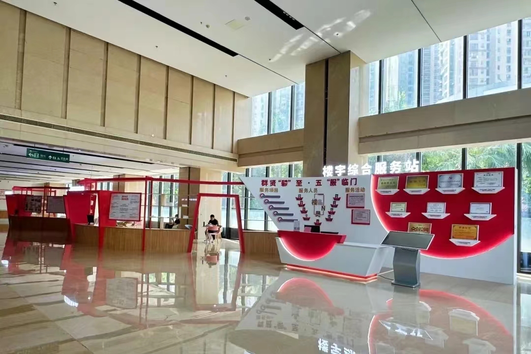 随着调研活动的尾声,实践队步入碧湖街道楼宇党群服务中心,队员们了解到碧湖街道涵盖20栋商务楼,属于超大体量的垂直社区。龙文区特色的“红领带”楼宇党建模式助力营商环境优化提升,整合了科局、街道、社区、物业等党员干部职工,促进了共建、共管、共治、共享良好氛围形成。
